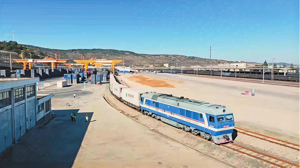 运载着出口肉松的列车驶出腾俊陆港。通讯员 王莹辉 摄