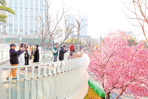 近日,连接昆明老街与黄公东街的翠湖城市绿道空中栈道旁,冬樱花盛放,吸引众多市民和游客驻足观赏。