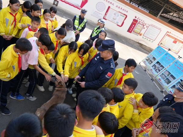 活动正式启动后,一系列丰富多彩的活动随即展开。最让孩子们期待的莫过于警犬技能展示环节,随着训导员的指令,两只训练有素的警犬依次完成了基础服从、物品搜检等科目。当警犬精准找到隐藏的模拟物品,又迅速完成模拟抓捕动作时,现场响起阵阵欢呼。“警察叔叔,这只狗狗叫什么名字呀?它平时都做什么呀?”一名小男孩勇敢地走上前问道。训导员蹲下身子,温柔地摸了摸警犬的头:“它叫‘云九’,是我们的无言战友,平时主要负责边境搜毒、搜爆和协助抓捕工作哦。”小男孩听得入了迷,小心翼翼地伸出手,在训导员的指导下轻轻抚摸了“云九”的背部,脸上满是欢喜。