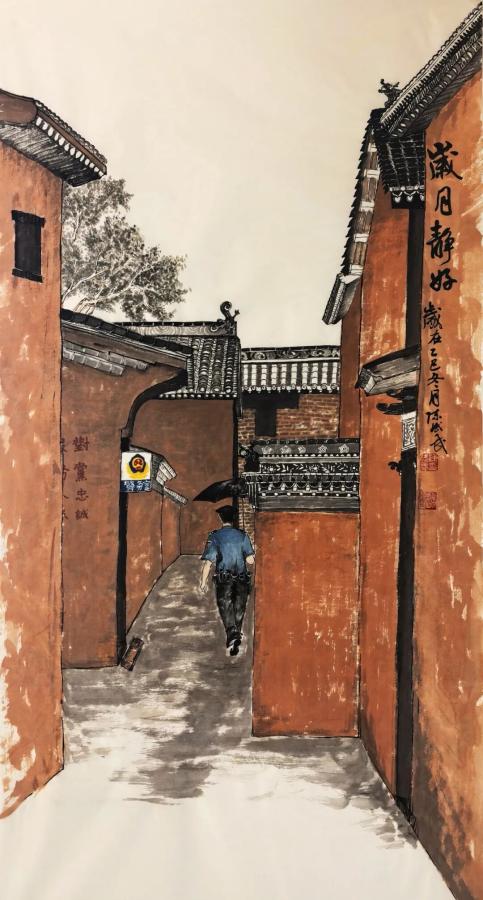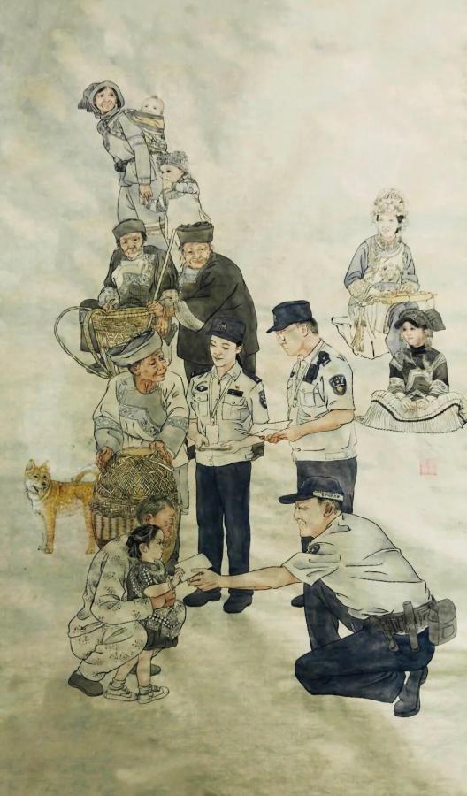 它们是中国画《法治春风润民》,刘梦雯创作;中国画《岁月静好》,陈斌武创作;中国画《云岭铁军守护安宁》,岳维传创作;中国画《山河通途·警守万家》,周烈彪创作。这些来自基层警营的笔触生动诠释了“人民公安为人民”的深厚情怀与坚定信仰。