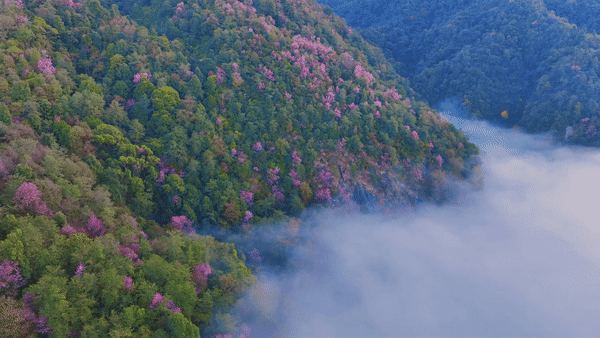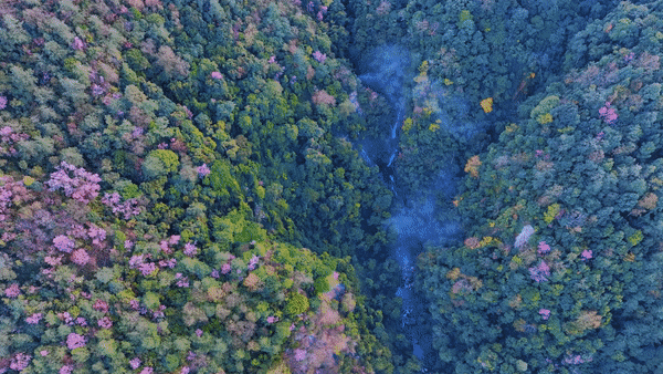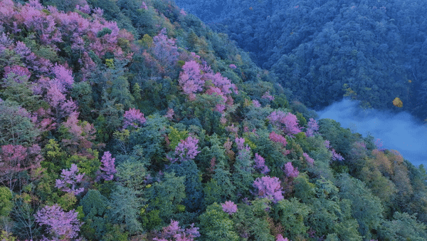 近日,在云南省腾冲市曲石镇青岩子,高山峡谷间大片野生冬樱花进入一年一度的盛花期。成百上千株野生冬樱花绽放,粉色的花朵装点在绿意之上,构成一幅唯美画卷。(屈晓丽 刘正凡 张世东)