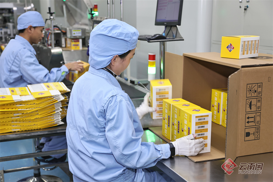 云南植物药业有限公司工人在颗粒剂自动包装线生产过程中将已完成中盒包装及追溯码扫码关联的每中盒灯盏细辛颗粒放入纸箱中。