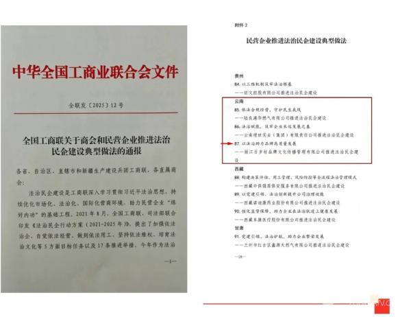 云南网讯(记者 龙彦 通讯员 和凌鸲)日前,记者获悉,在第六届民营经济法治建设大会上,全国工商联发布《关于商会和民营企业推进法治民企建设典型做法的通报》,来自云南丽江市的百岁坊品牌文化传播管理有限公司推送的“以法治助力品牌高质量发展——推进法治民企建设的实践案例”成功入围。