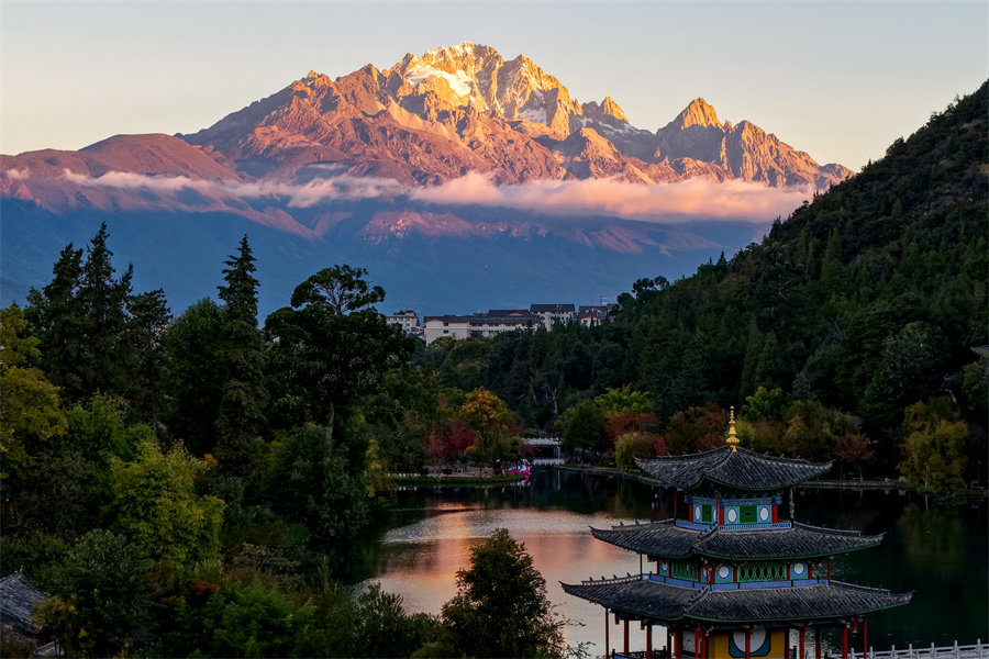 在丽江黑龙潭公园,金色的玉龙雪山倒映潭中,与亭台楼阁相映成趣,“双份”美景令人沉醉。胡妤雅 摄