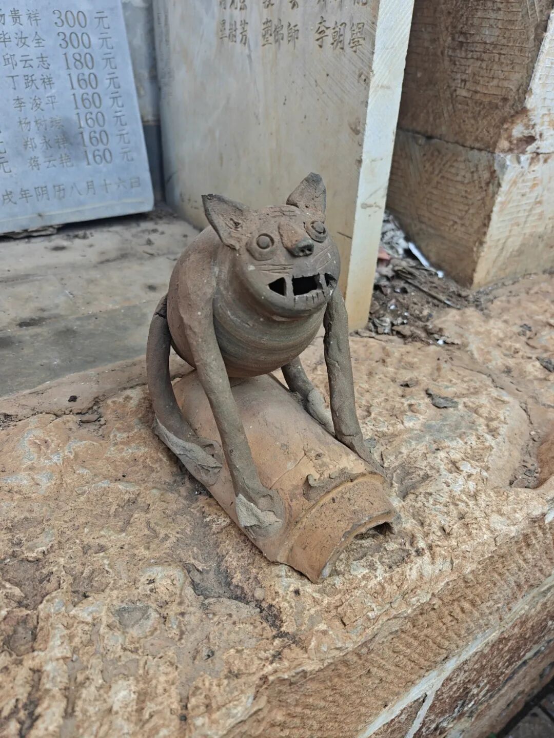 循着文献记载,考察队核对文庙建筑东廊的确共有七间房,为明清时期的建筑风格,地基和石阶仍然是旧时留存下来的。还值得一提的是,旁边还有云南赫赫有名、镇宅纳福的守护神——瓦猫。