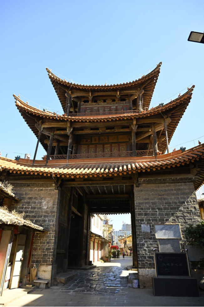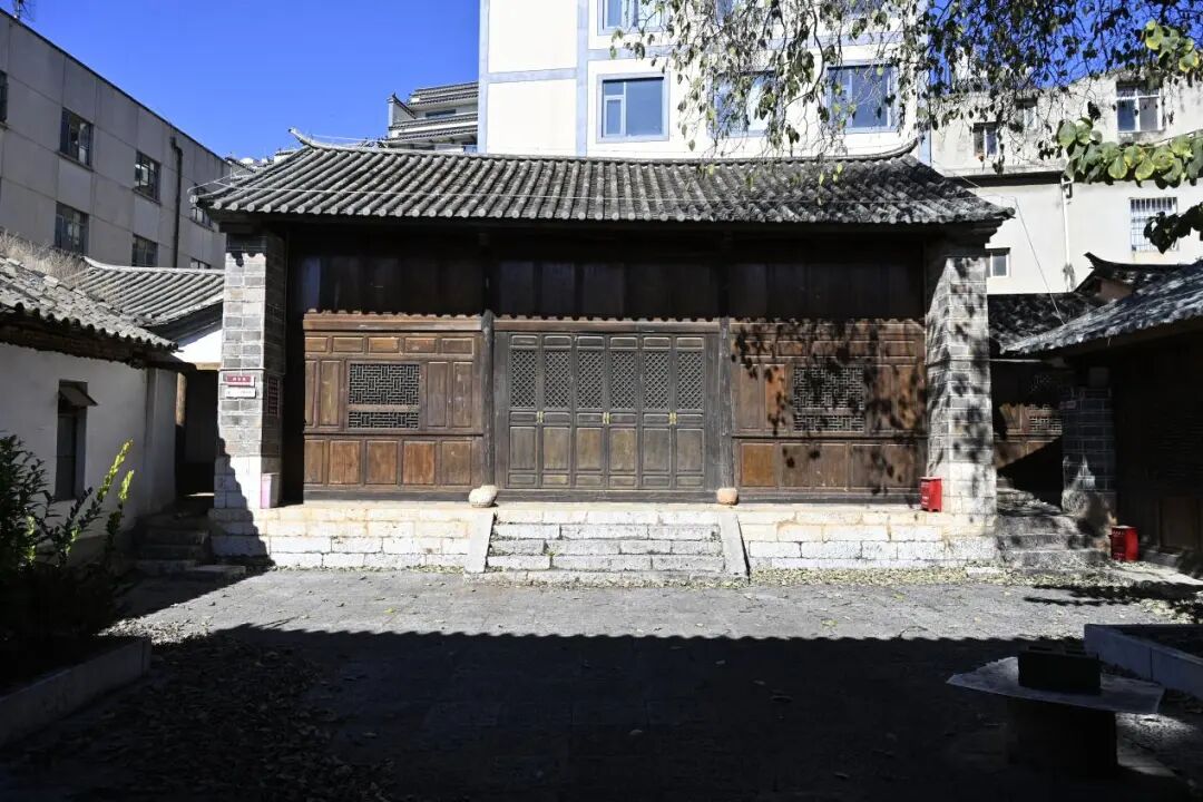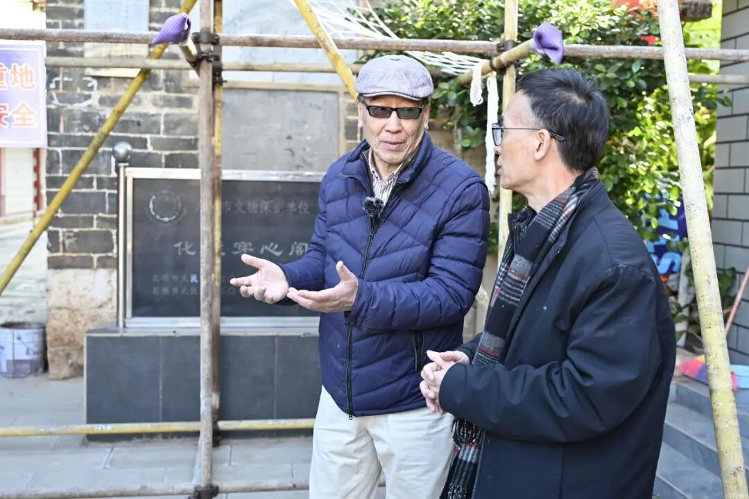 12月1日上午,考察队率先抵达中大在呈贡办学核心区域“化城”。化城乃归化县城之简称,对应明末清初的“归化县”。它曾为云南省域内面积最小的县份,清康熙七年(1668年)并入呈贡县。岁月流转,如今已成为昆明高新区马金铺街道办下辖的化城村。村内街道由青石板铺就,街区中轴线上矗立着穿心魁阁楼,西面有土主庙、水云寺,南面有城隍庙、武庙,北面有天王庙与书院,东侧有文庙、大佛寺,化城村由此形成“一阁七寺一书院”的古建筑格局。全面抗战时期,化城村穿心阁旁的文庙、书院及城隍庙等成为中山大学的教学、实习、设备存放以及师生宿舍场所。