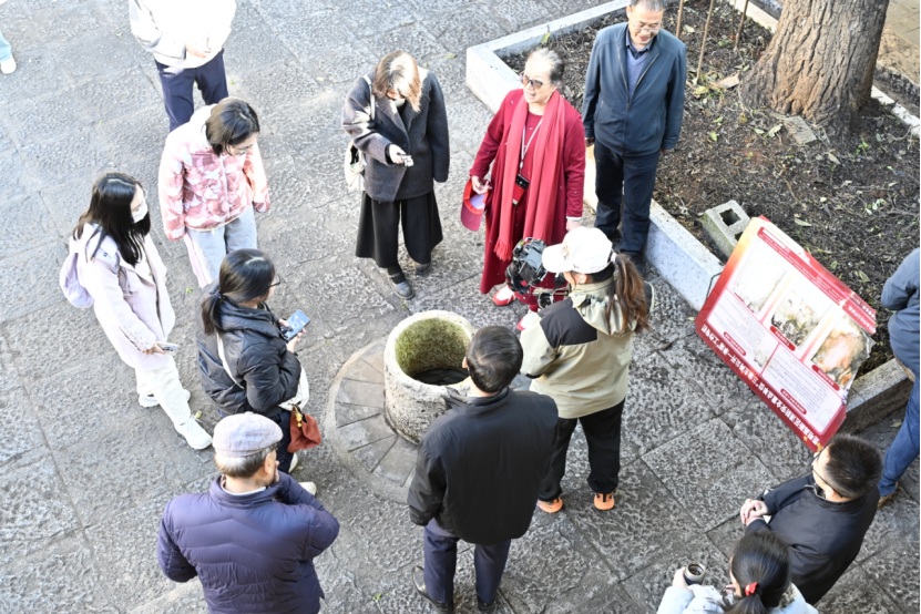 考察队在书院水井旁讨论中大医学院办学历史。图中身着红衣者为文娜