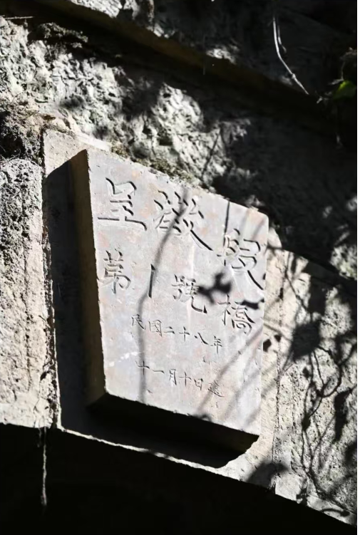 桥洞两侧的顶部各嵌着一方碑刻,一块嵌在外侧,首次发现了镌刻着“呈澄段,第一号桥,民国二十八年十一月十日建”的字样。这里第一号桥应该就是中大与云南省公路局合修的昆澄公路之呈贡马金铺到澄江关键工程姑娘桥;立碑时间是1939年11月10日,即国立中山大学建校十五周年校庆前一日,意在为校庆献礼。另一块则在如今新修公路下方的桥洞内,碑上字迹与外侧那块一致,只是因后期桥梁改建,部分字迹被水泥覆盖遮挡。后人因此处地势过低,便在老桥之上再加建一层桥面,老桥从此被覆盖在新桥面之下。再后来,因道路拓宽需求,施工方在狭窄的姑娘桥旁贴着建起一座新桥,便形成了我们如今看到的模样。