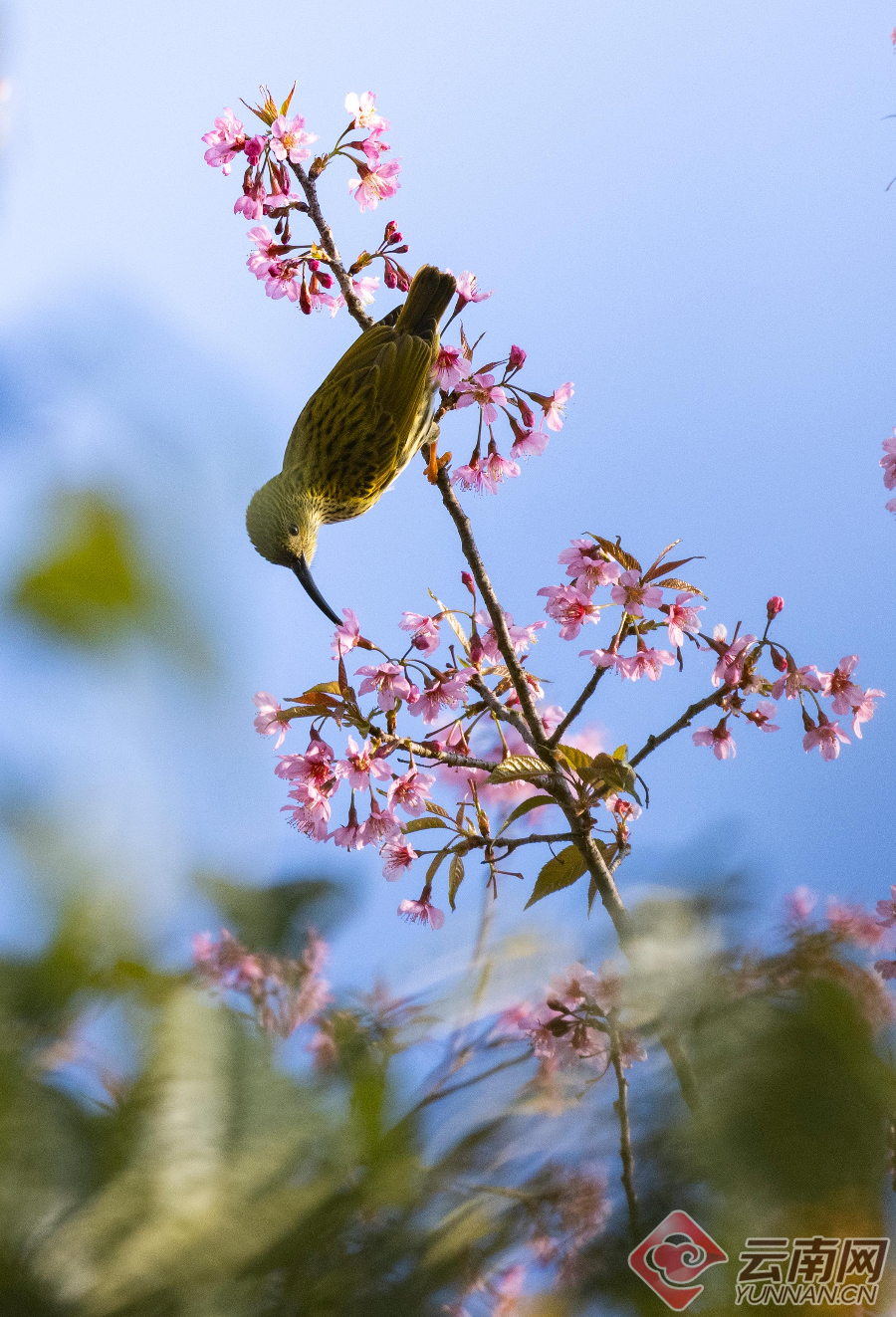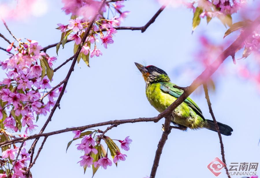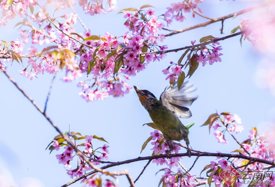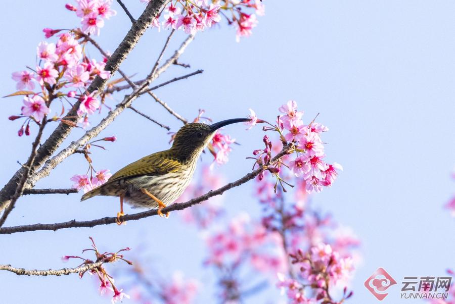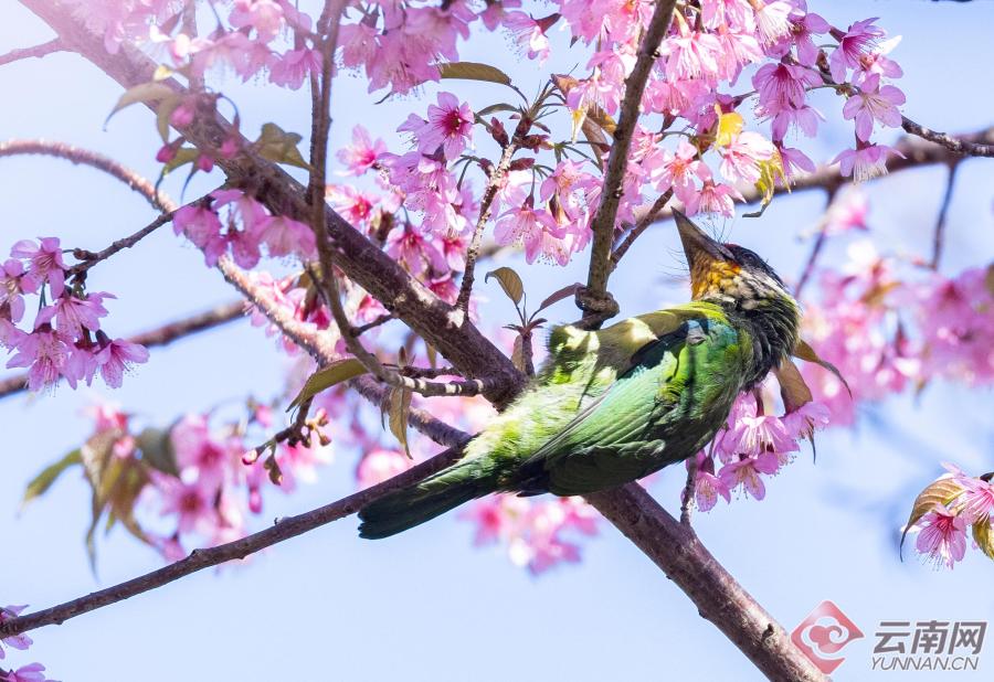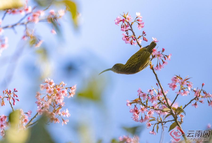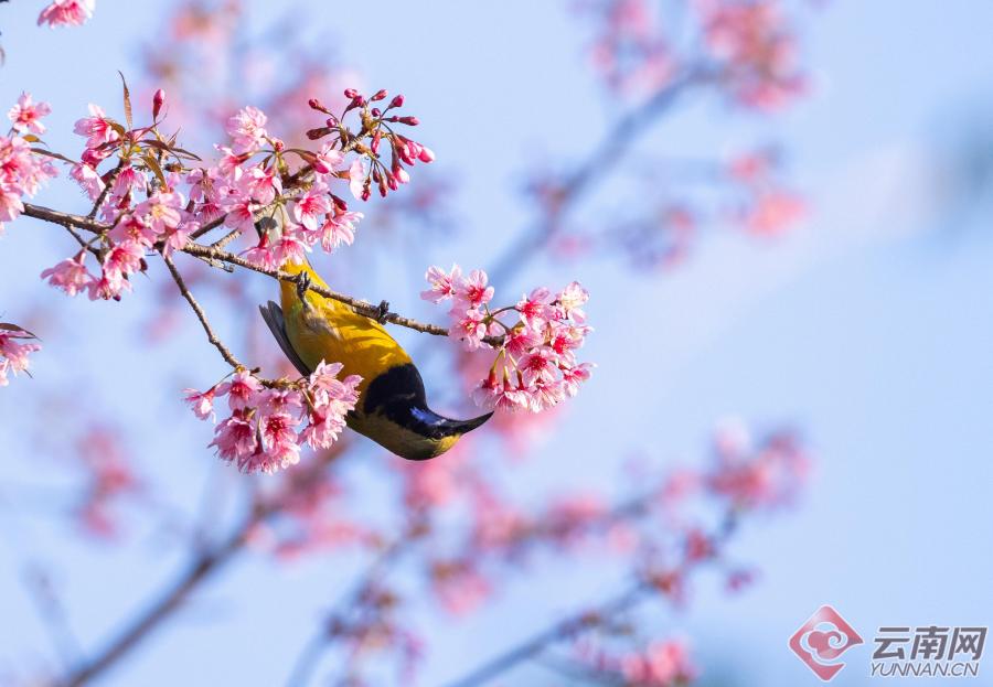 暖阳倾洒,这片花海更是鸟的天堂。纹背捕蛛鸟、橙腹叶鹎、黑短脚鹎、黑剪尾、太阳鸟等羽色斑斓的小精灵,成群结队翩然而至。它们时而悬停花枝吮蜜,时而倒挂枝头嬉戏,时而振翅俯冲掠过花海,时而轻点花瓣觅食啄饮。鸟儿们黄红绿、青蓝紫的艳丽羽衣,与枝头粉白的繁花相映成趣,叽叽喳喳的鸣叫声清脆悦耳,声声都透着蓬勃的生机。