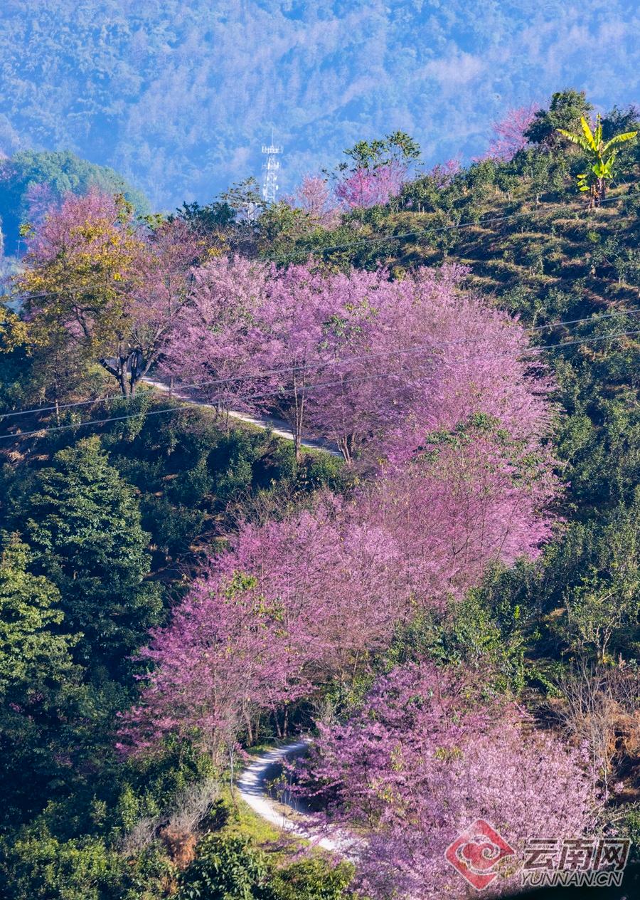 层峦叠嶂间,一树树冬樱花恣意盛放,花团锦簇,如霞似雾,又似一条腾跃的彩龙,在青山碧岭间舞动生姿。那是万亩樱桃花海,在冬日暖阳下肆意燃烧着生命的绚烂。