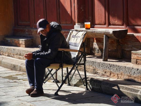 红褐色夯土墙藏着烟火气,石板路上日光如碎金——阳光是旧的,照过几代人;石头是暖的,焐着往来脚印。藤椅上的老者戴着毛糙棉帽,藏蓝中山装洗得柔软,双手皱纹如老藤盘绕,垂目间似把一生重量轻放膝头,与旧木门、土墙构成一幅温软画面。