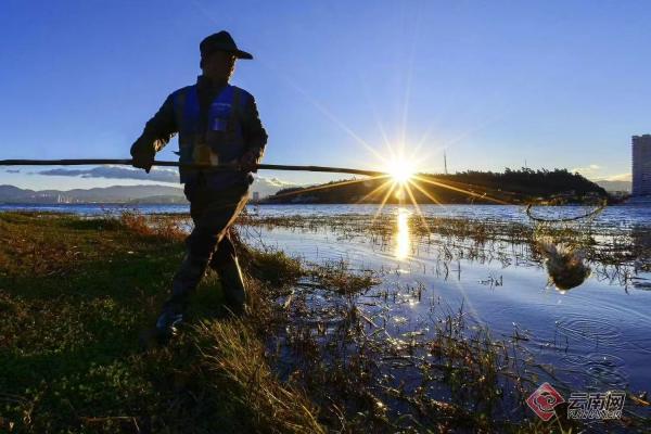 冬日清晨的大理洱海龙龛码头,朝阳穿透云层,金色霞光将岸边的杉树林映衬得格外艳红。成群的西伯利亚红嘴鸥展开白色的羽翼在空中盘旋,一对对婚纱旅拍的情侣沿着海岸站成风景,甜蜜浪漫的氛围在天地间晕染。