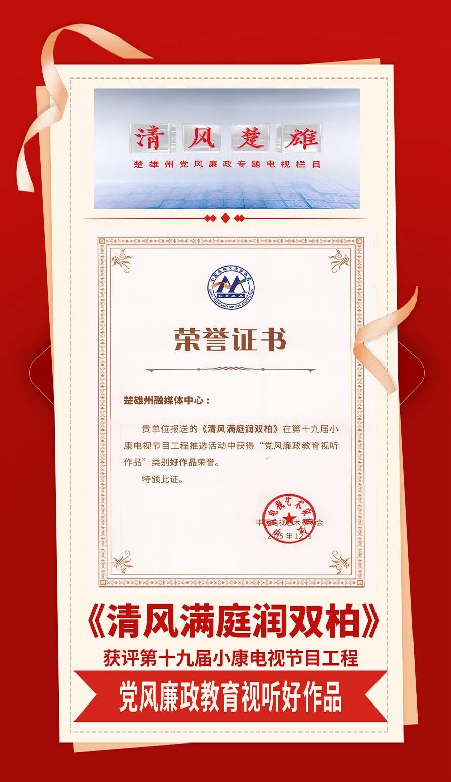 近日,第十九届小康电视节目工程荣誉揭晓主题晚会在福建宁德举办。云南省纪委监委宣传部报送的《纵深推进》获评“党风廉政教育视听优秀作品”,楚雄州融媒体中心报送的《清风满庭润双柏》、昆明理工大学报送的《照壁上的家风》获评“党风廉政教育视听好作品”。接下来,让我们一同回顾这些获奖作品。