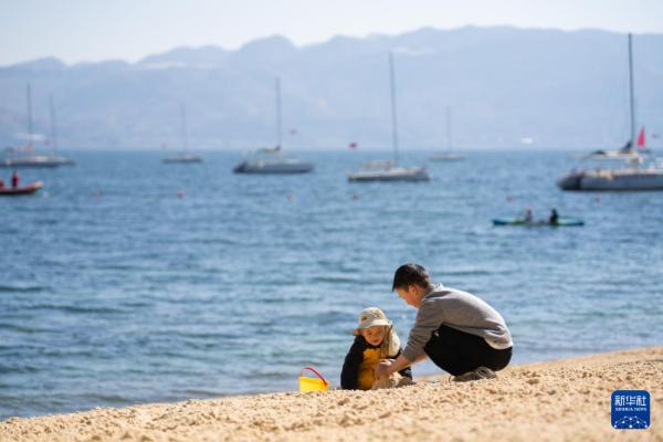 1月27日,游客在云南省玉溪市抚仙湖畔休闲。新华社记者 高咏薇 摄