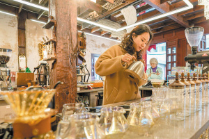 在翠湖边的一家咖啡馆里,工作人员为客人制作咖啡。这家咖啡馆由一栋清朝老宅改造而成,已有百年历史。