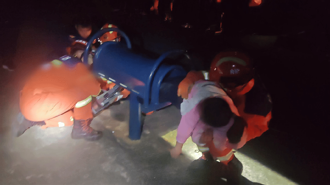 消防员赶到现场后,看到一名小女孩腿部卡在桶状运动器械内,上半身靠双手撑在地上,以俯卧撑的姿势等待救援。