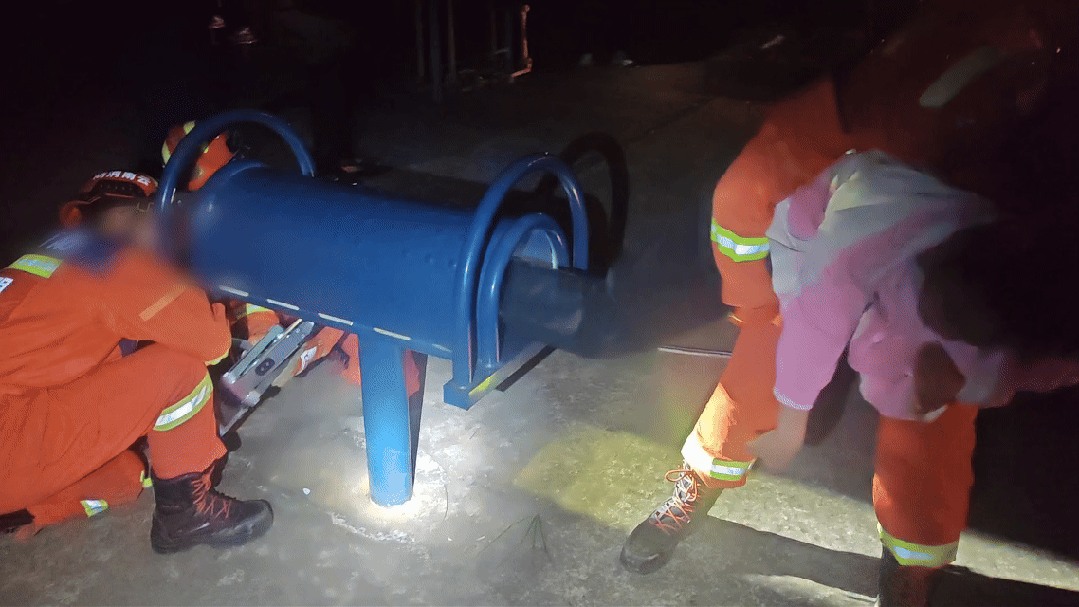一名消防员立即托住孩子上半身,缓解“窘境”,另外两名消防员借助液压扩张钳,沿设施底部缝隙进行扩张。