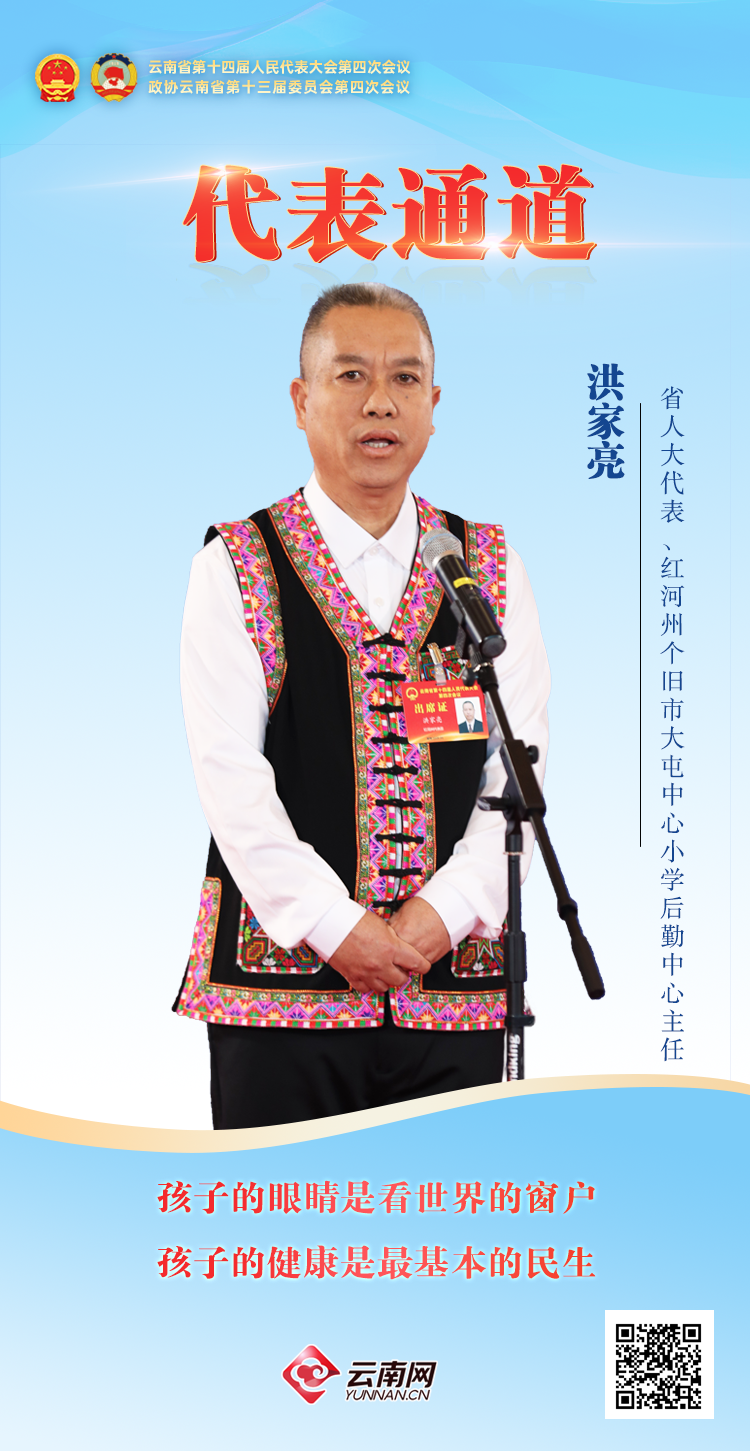 “作为一名基层教育工作者,我始终认为,孩子的眼睛是看世界的窗户,孩子的健康是最基本的民生。”走上代表通道,省人大代表、红河哈尼族彝族自治州个旧市大屯中心小学后勤中心主任洪家亮如是说。