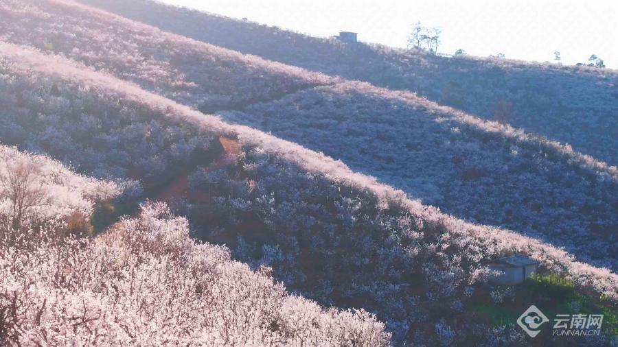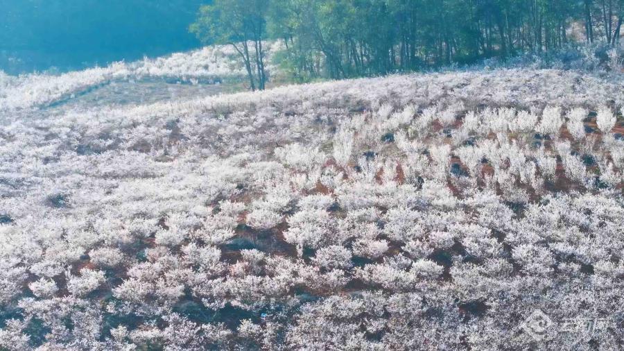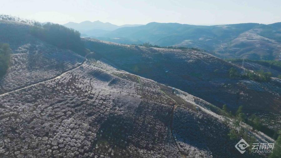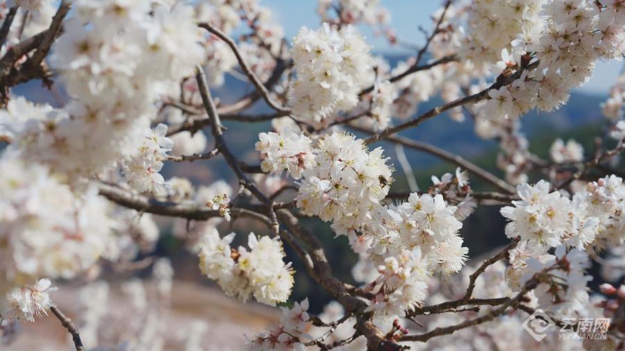 在楚雄彝族自治州武定县狮山镇吆鹰村,刚踏上108国道,樱桃花林就映入眼帘,白茫茫的山坡上,雪白的樱桃花海绵延几公里,整个村庄被花海包围,它们相互掩映,恬静安详。未入其林,先闻其香,走进樱桃花林间,蜜蜂嗡嗡,风掠过枝头,花瓣簌簌落在肩头。伸手轻触,是花瓣的柔软;闭眼聆听,是蜂鸣与风声的合奏。