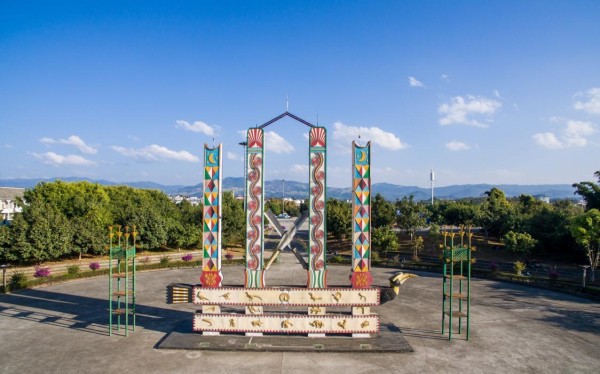 认识目瑙纵歌,要从舞场中央矗立的“目瑙示栋”开始。四根高耸的柱子上,彩绘着象征生命起源的自然图案,以及螺旋状蕨形纹、回旋纹等代表祖先迁徙路线的繁复纹路,这些深植于中华文明共同审美的哲学认知,是景颇族先民对自然秩序的深刻理解与诗意表达。