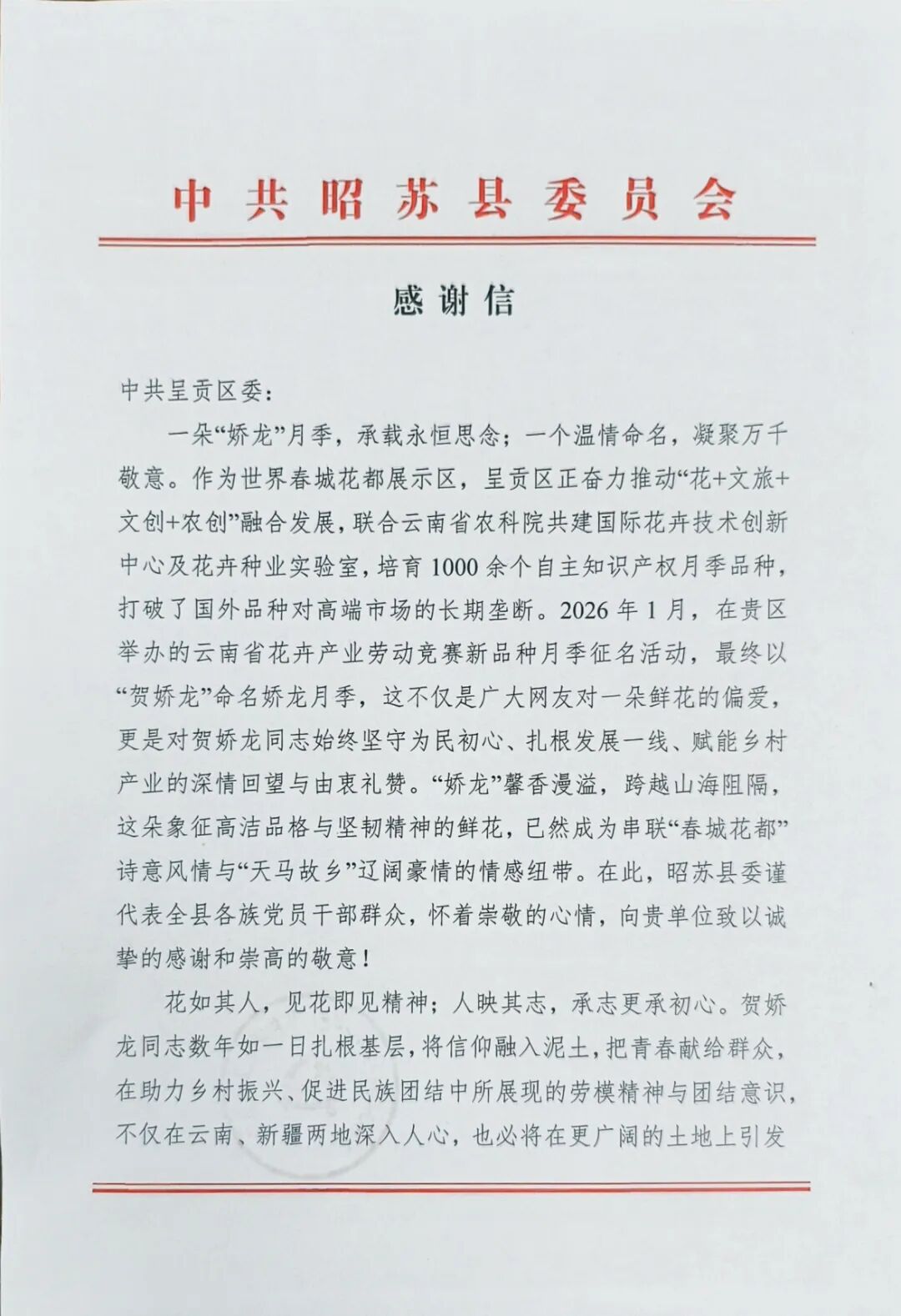 “一朵‘娇龙’月季,承载永恒思念;一个温情命名,凝聚万千敬意。”近日,一封盖有中共昭苏县委员会鲜红印章的感谢信,从天山脚下跨越四千公里山河,抵达云南昆明呈贡。