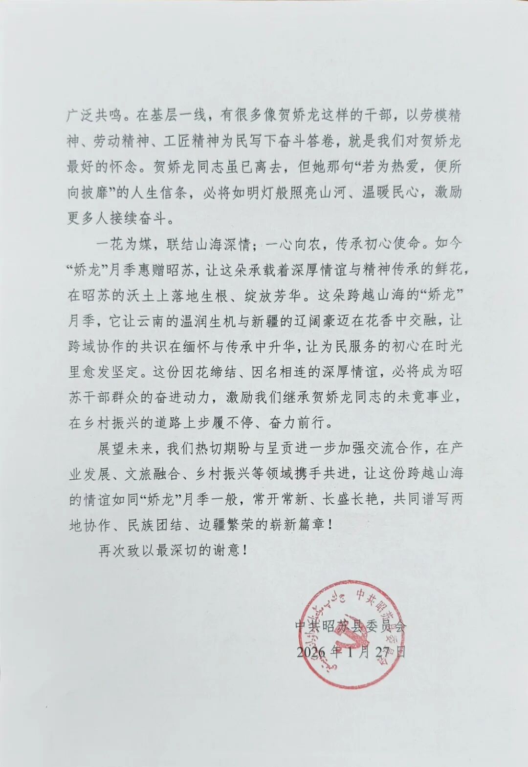 这不是一封寻常的公函。信纸轻,落款重。昭苏县委在信中写道,这朵以已故基层干部贺娇龙同志命名的月季,“已然成为串联‘春城花都’诗意风情与‘天马故乡’辽阔豪情的情感纽带”。信末,昭苏热切期盼与呈贡“在产业发展、文旅融合、乡村振兴等领域携手共进”。