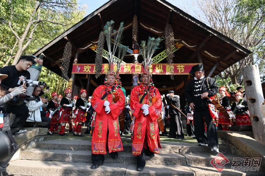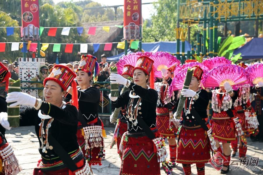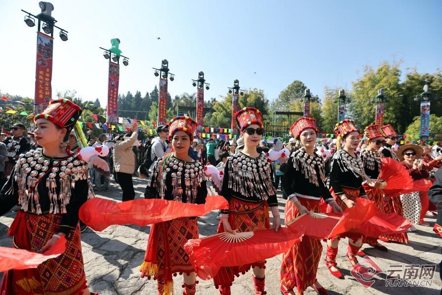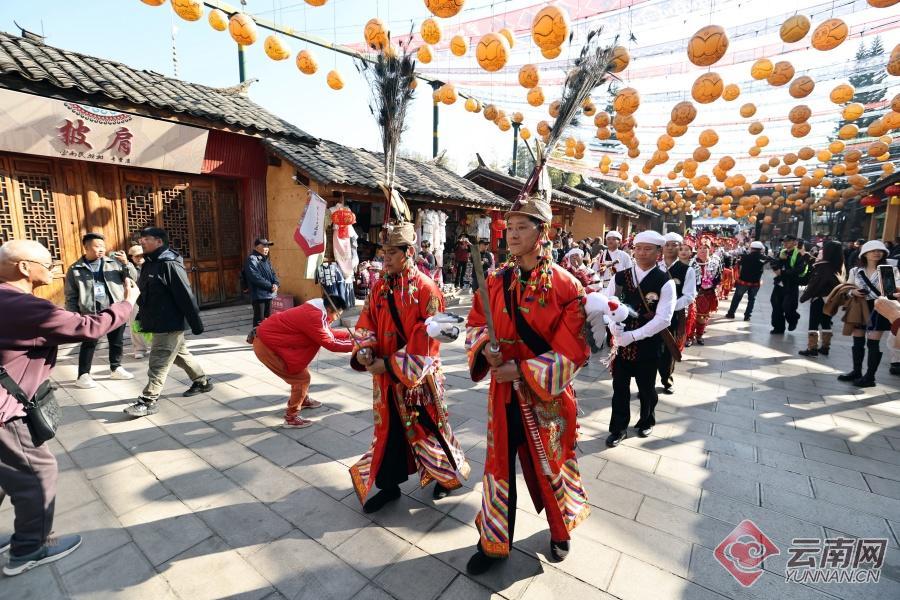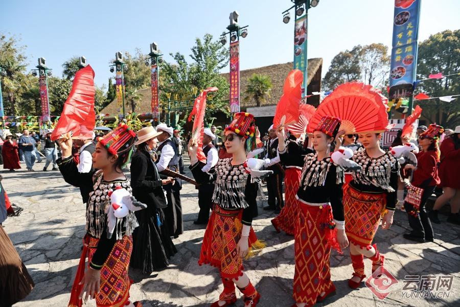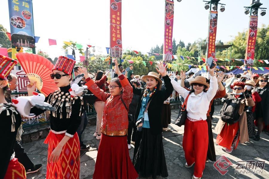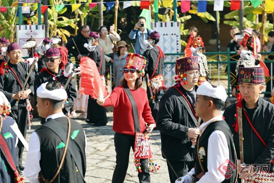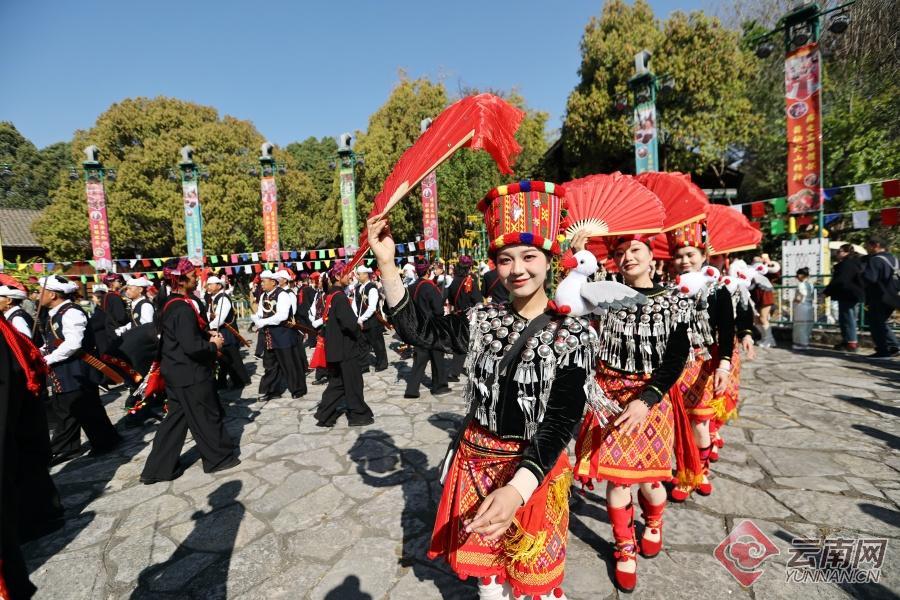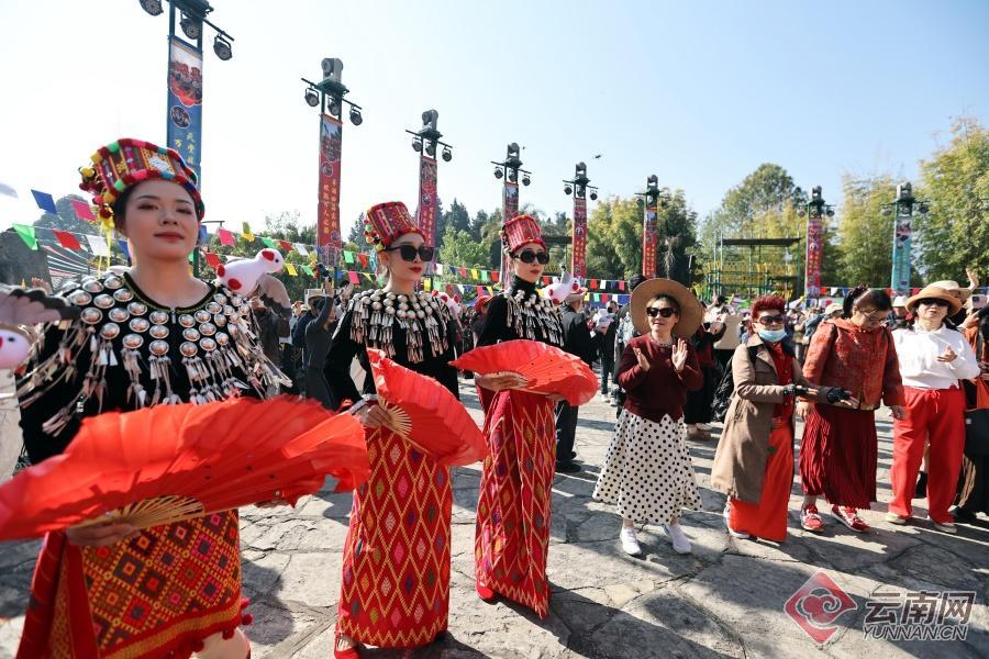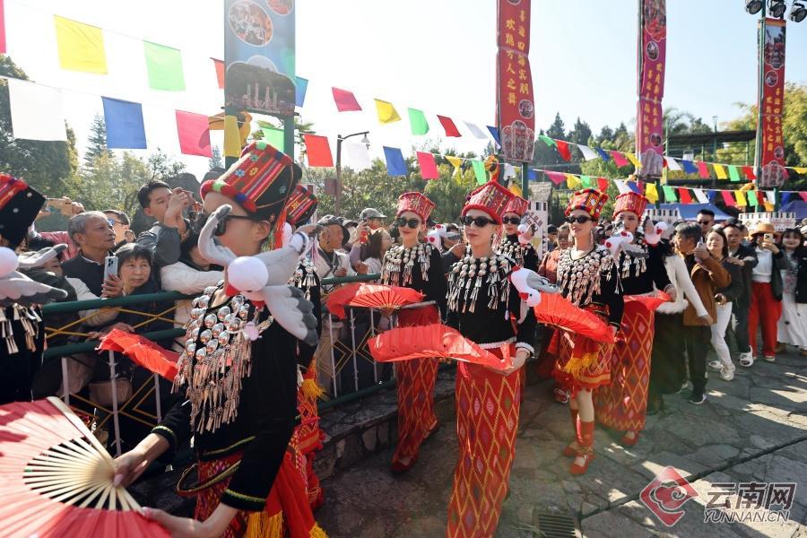 2月17日大年初一,云南民族村景颇寨目瑙示栋广场锣鼓喧天,景颇族“目瑙纵歌”在这里精彩上演。来自全国各地的游客在“瑙双”“瑙巴”的带领下,与手持彩扇的姑娘和舞动长刀的小伙一同排成两条长龙,踏着鼓点纵情欢跳,在激昂明快的节奏中,沉浸式感受“有一种叫云南的生活”。