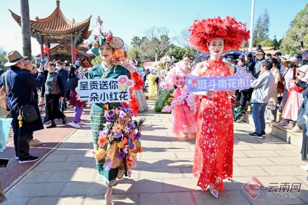 文艺演出落幕,民俗巡游接力。巡游队伍宛如一幅流动的、活态的民俗画卷,除了大头娃娃、划旱船等传统表演,“花仙子”队伍尤为引人注目。演员们身着以鲜花元素设计的华美服饰,与“亚洲花都”的城市名片呼应。掌声、欢呼声与巡游音乐交织,共同汇成喜庆祥和的“春潮”。