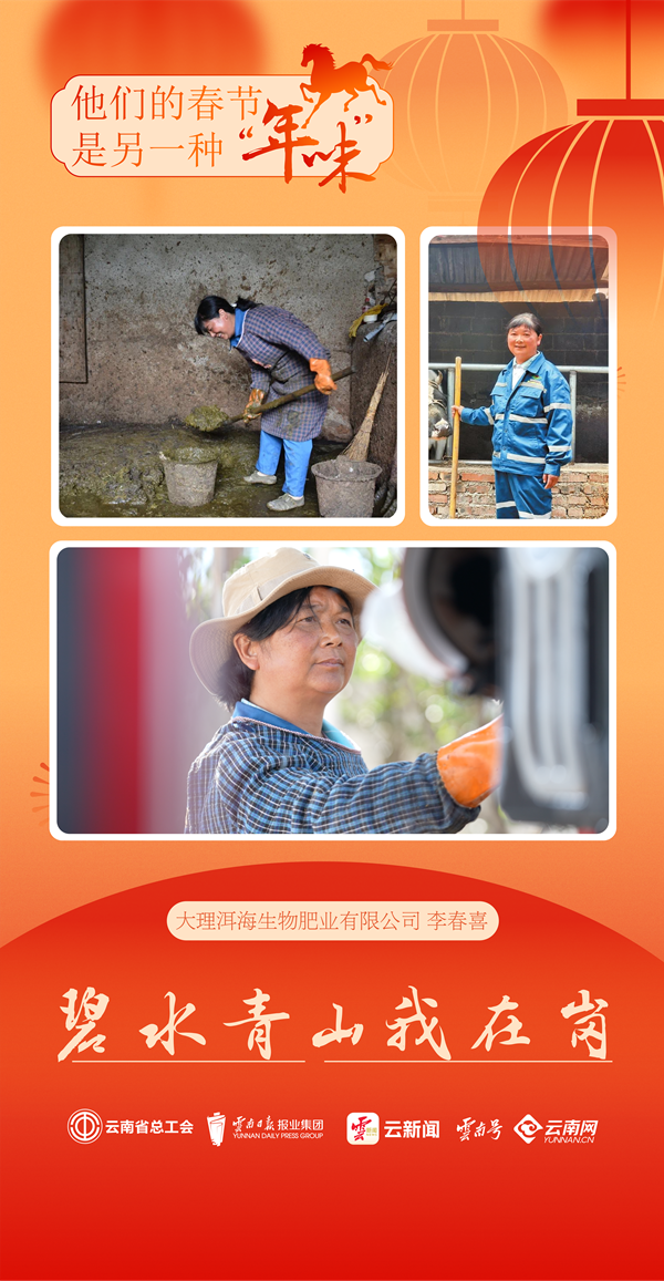这些年,她往返于上寺村与收集站达12000多次,行程累计超37040公里,收集畜禽粪便11600多吨,用坏了200多副手套、4辆三轮车,被乡亲们亲切地称作“牛粪金花”。春节里,别人走亲访友、阖家团圆,她依旧奔波在田间地头,家人虽有不舍,却也理解她的坚守。她始终记着“一定要把洱海保护好”的殷殷嘱托,用自己的绵薄之力,在平凡的岗位上默默奉献。这个马年新春,李春喜依旧用日复一日的坚持,守护着洱海源头的水清岸绿,让洱海的年味,藏在一抹清新的绿意里。