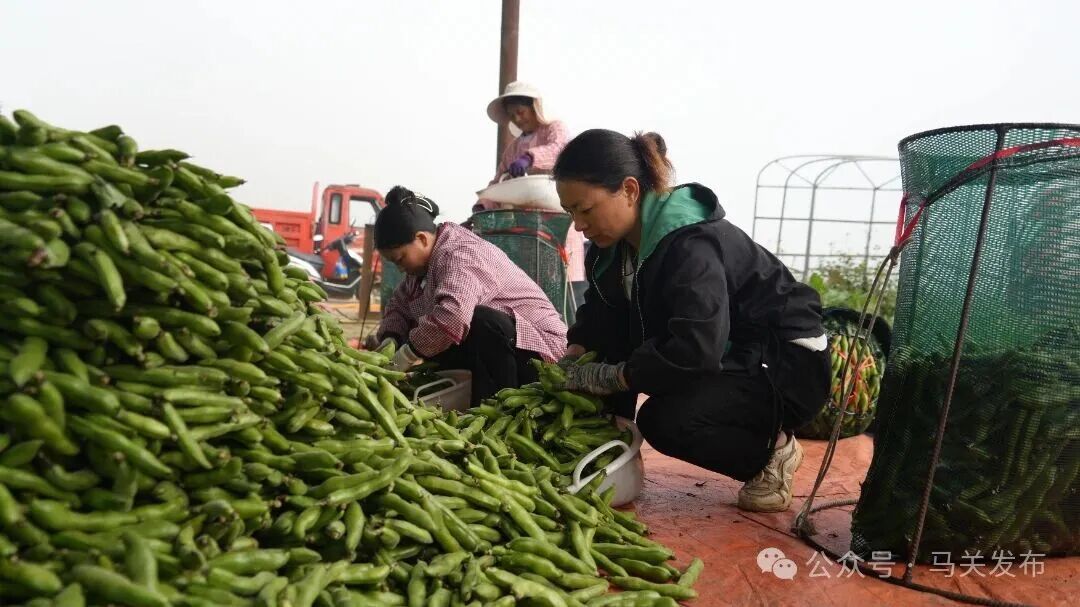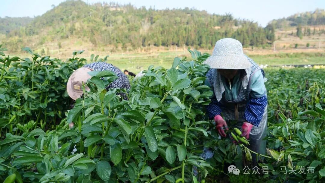 同样,在坡脚镇马夹冲蔬菜基地,连片蚕豆长势喜人,工人们正抢抓时节进行采摘、分拣与装运,田间地头一片繁忙。