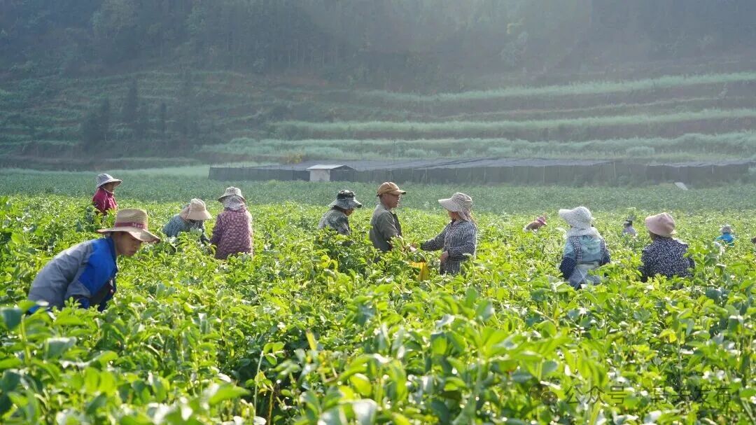 正值采摘关键期,村民们穿梭在绿意盎然的田间地头,熟练地进行采摘、装袋、搬运、一派繁忙有序、喜气洋洋的丰收景象。