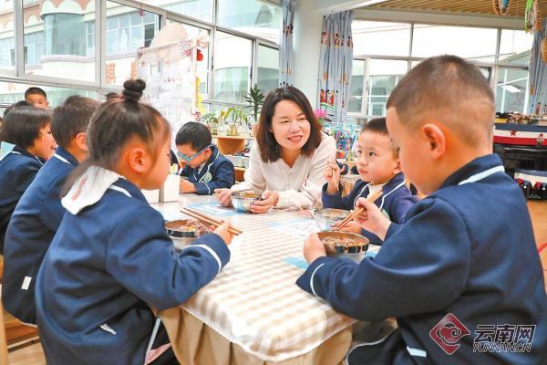麒麟区二幼的家长到班级陪餐。通讯员 张照彬 摄