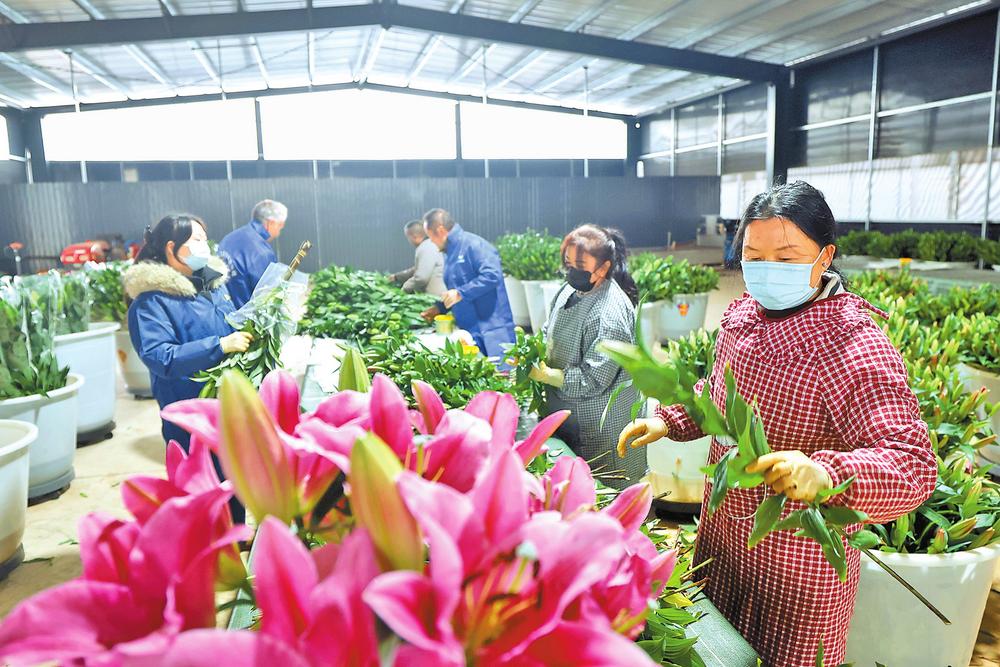 玉溪市江川区九溪镇六十亩村种植百合花近30年,2023年与玉溪曙禾花卉有限公司共建鲜花产业园,通过引培优质种球、发展无土栽培、建智能冷库、统一市场营销,亩均产值从4万元左右提升到14万元。目前,全村有百合花种植户568户,种植面积达3500亩,年销售收入超1.6亿元。图为产业园内,工作人员正在分拣包装百合花。
