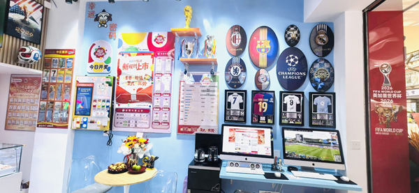 升级后,体彩店崭新的门头与时尚的装修风格相得益彰。门店外,3D显示招牌灯箱循环展示着欧洲五大联赛顶级球队标识,很是抓人眼球。步入店内,正前方是110英寸大屏,不间断地播放着各类体育赛事及新闻。主背景墙为中国体育彩票的字样和标识,但与其他体彩店不同的是,在两侧添加了“翠湖”字样和海鸥的元素,将“体彩+文旅”的特色展现得淋漓尽致。屋顶上1.2米直径外圆、0.6米直径内圆组成的立体环绕灯,配合多组射灯、筒灯,营造出明亮氛围。墙壁两侧也经过精心设计,左侧安装有6块电子显示屏,实时同步购彩者关心的数据;右侧则配有带电子显示屏的大乐透选号器,全方位为购彩者带来便捷、智能的购彩服务。