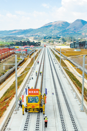 3月18日,在昆明市嵩明县崔家庄铺轨基地,随着中铁十六局铺轨机的精准作业,第一对500米长钢轨稳稳落在无砟轨道上,这标志着渝昆高铁云南段铺轨施工正式启动,渝昆高铁建设全面迈入攻坚冲刺阶段。目前,渝昆高铁路基、桥梁工程已圆满收官,全线最复杂的控制性工程昭通隧道即将实现全隧贯通,新建站房已进入装修收尾的关键时期,项目建设呈现出多点突破、高效推进的喜人态势,有望在今年年底达到开通条件。
