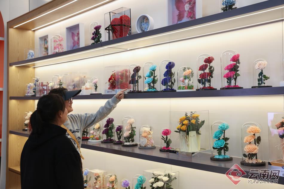 游客在丽江现代花卉产业园内选购玫瑰永生花产品。高吴双 摄