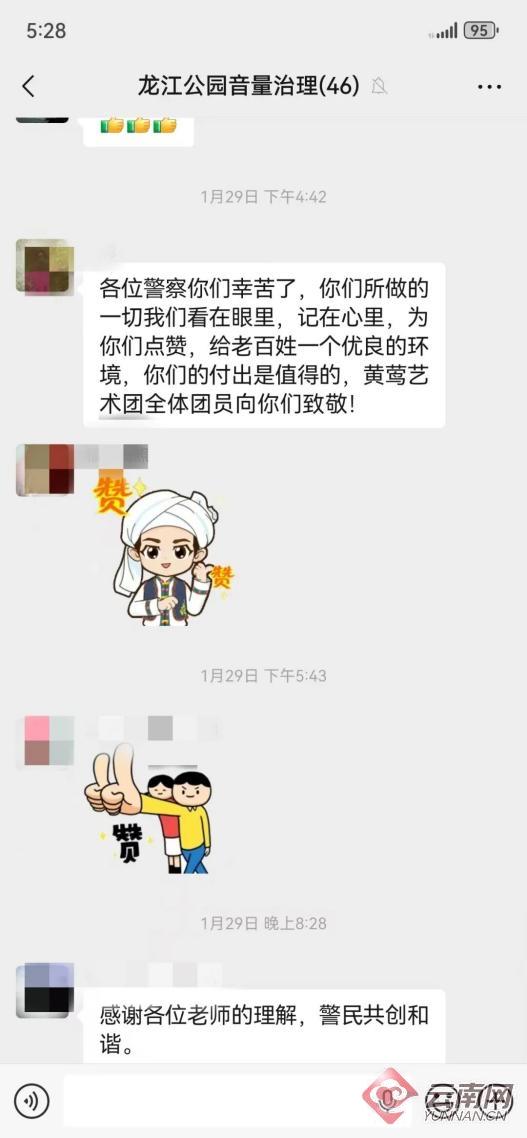 “今日天冷,玩音乐的各位老师请注意保暖。请注意音量控制,音响开口请务必朝向公园内部,减少外溢扰民。”打开群聊,民警在群里发送的温馨提示比比皆是。
