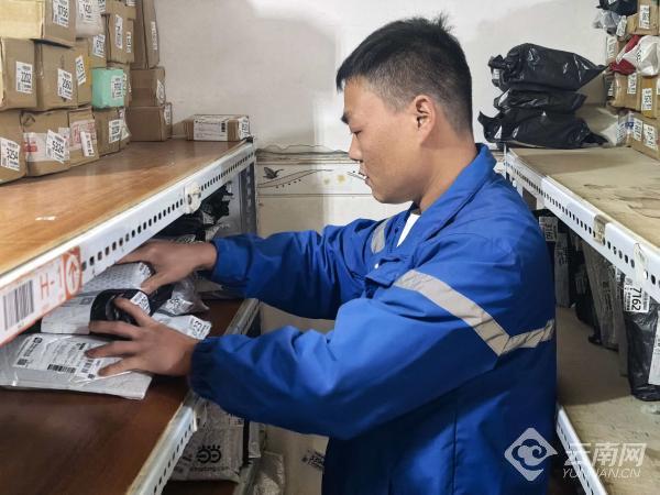 快递小哥张志高正在摆放快递