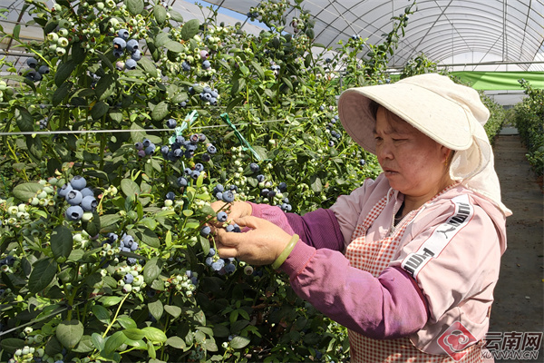 眼下,正值云南花香蓝莓大量上市的季节。在澄江市右所镇吉花村的蓝莓大棚里,毕大姐每天带领着24名村民在基地采摘。“按5元一公斤算,我们一天能挣150元左右。”她笑着说,“采摘季干得好,一个月收入6000多元不成问题。”