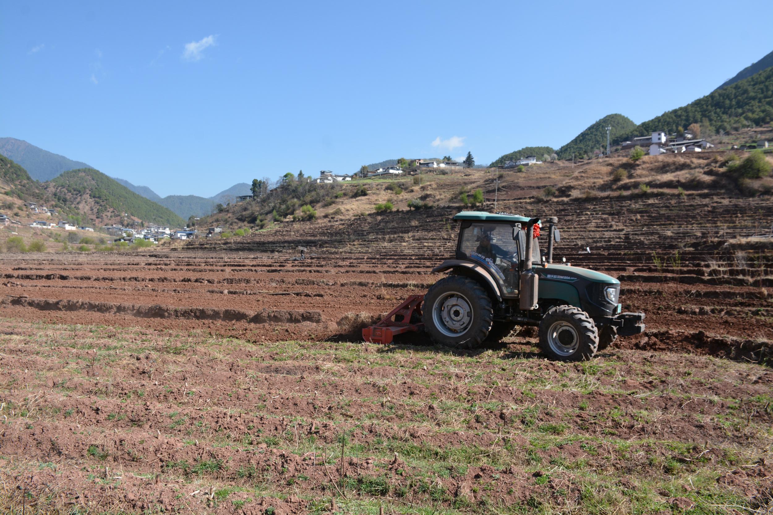 眼下正值春耕时节,在云龙县检槽乡师井村佛子坡千亩烤烟种植的田地里,农耕机正在耕地,一天可以耕地35亩到45亩,大大提高效率。