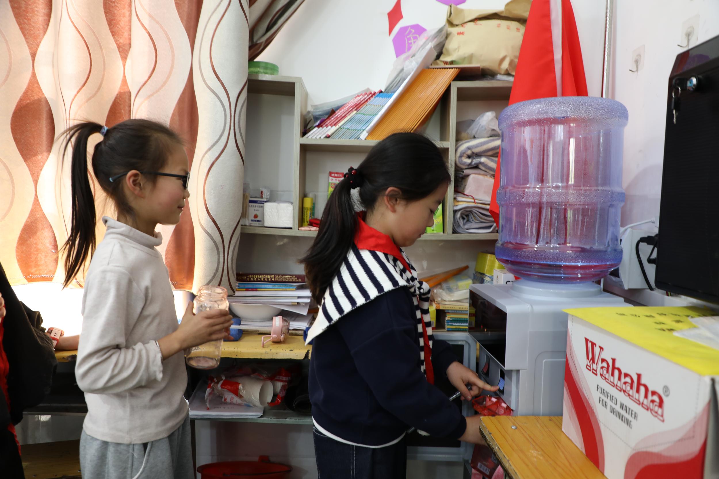 崭新的净水设备旁,孩子们轻轻拧开水龙头,清澈甘甜的净水汩汩流出,有常温的,也有热水。“这个水喝起来甜甜的!”学生罗芷怡开心地说。
