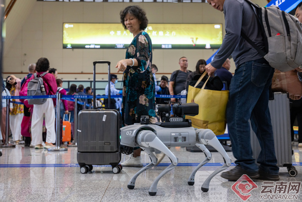 磨憨铁路口岸出境大厅内,智能机器狗正在开展巡逻警戒作业,同时提醒旅客提前备好有效证件,有序配合通关查验。 卫海林 摄