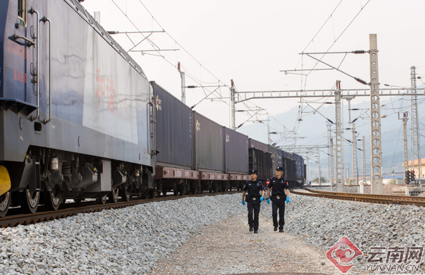 澜沧号列车出境前往老挝,磨憨移民管理警察正在对铁路沿线进行巡逻。 黄远飞 摄