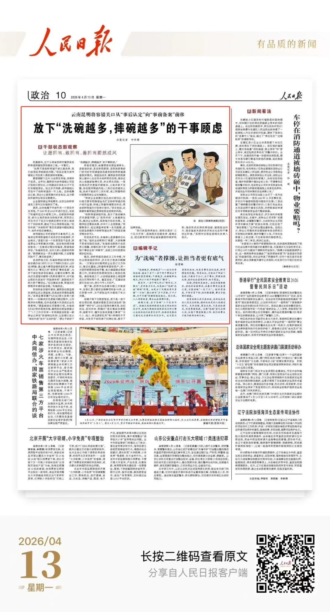 2026年4月13日,人民日报报道:云南昆明将容错关口从“事后认定”向“事前备案”前移 放下“洗碗越多,摔碗越多”的干事顾虑(干部状态新观察·让愿担当、敢担当、善担当蔚然成风)。