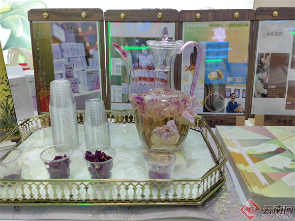 云南展区被五彩斑斓的鲜切花围绕,花香四溢;展台上更有鲜花饼、鲜花饮品、鲜花酿酒,云南鲜花可观、可食、可饮,用花香扮靓着“有一种叫云南的生活”。