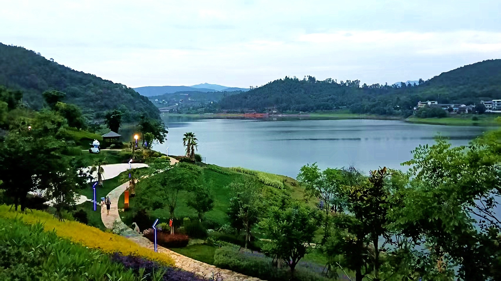 南山公园,更是一步一景。初心亭、清廉池、同心桥这些地方,不光名字好听,景色也耐看。那红红火火的山茶花,热烈地绽放着,像大红灯笼一样耀眼夺目;娇艳的海棠花在春风里竞相开放,那一抹嫣红,就像夕阳余晖映入眼帘,让人过目难忘;还有那粉嫩的樱花,在阳光下熠熠生辉,每一朵都有自己独特的风姿。池岸上的柳树也铆足了劲儿,一夜之间就吐出了新芽,黄绿嫩叶的枝条在春风中轻柔地拂动。这满园的春色,醉了小鸟,醉了游人,也醉了整个春天。