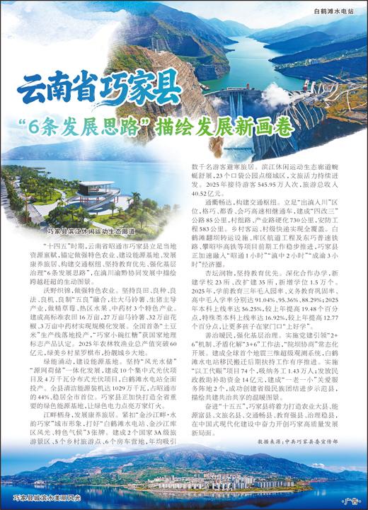 “十四五”时期,云南省昭通市巧家县立足当地资源禀赋,锚定做强特色农业、建设能源基地、发展康养旅居、构建交通枢纽、坚持教育优先、强化基层治理“6条发展思路”,在滇川渝黔协同发展中描绘跨越赶超的生动图景。