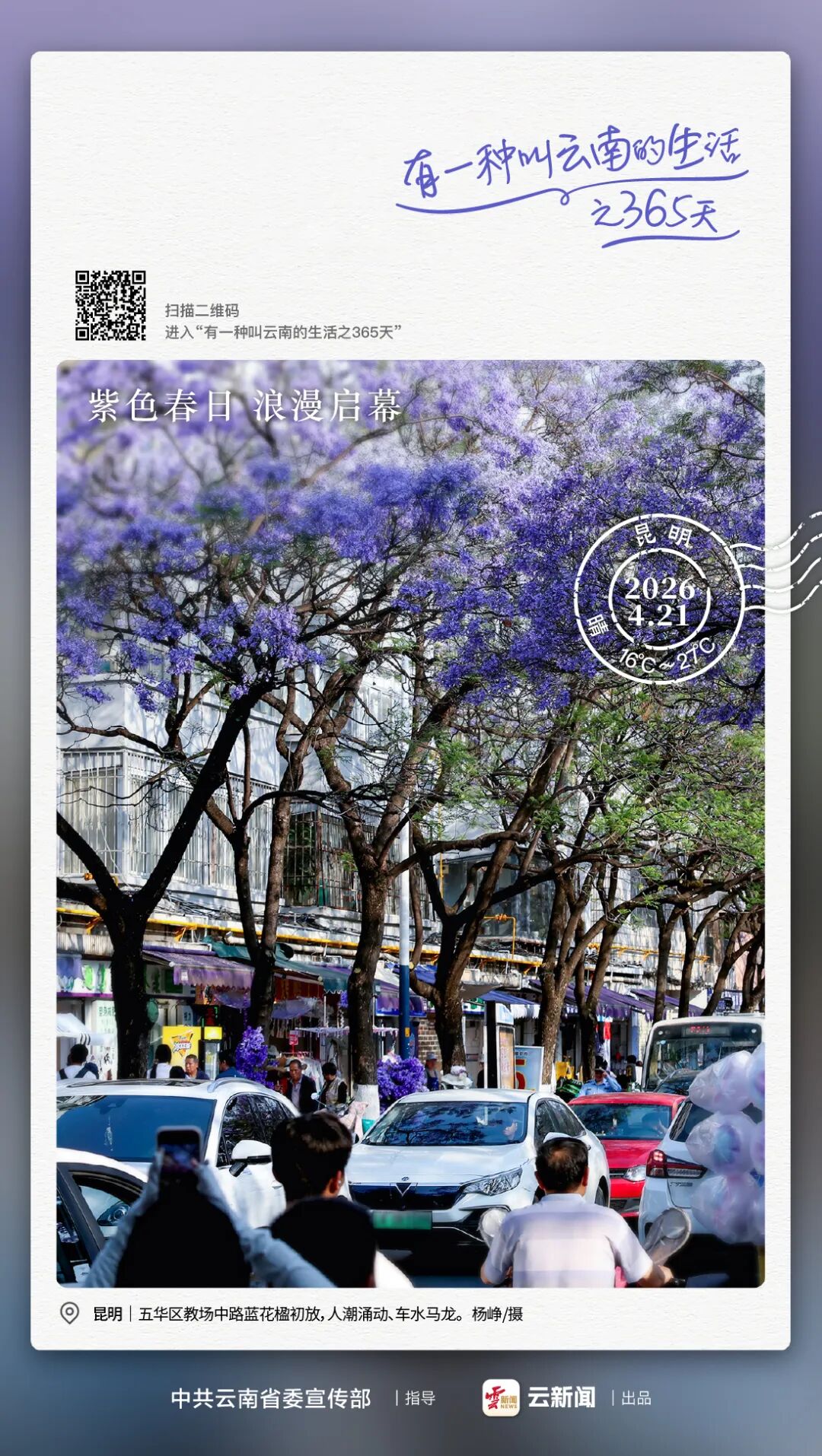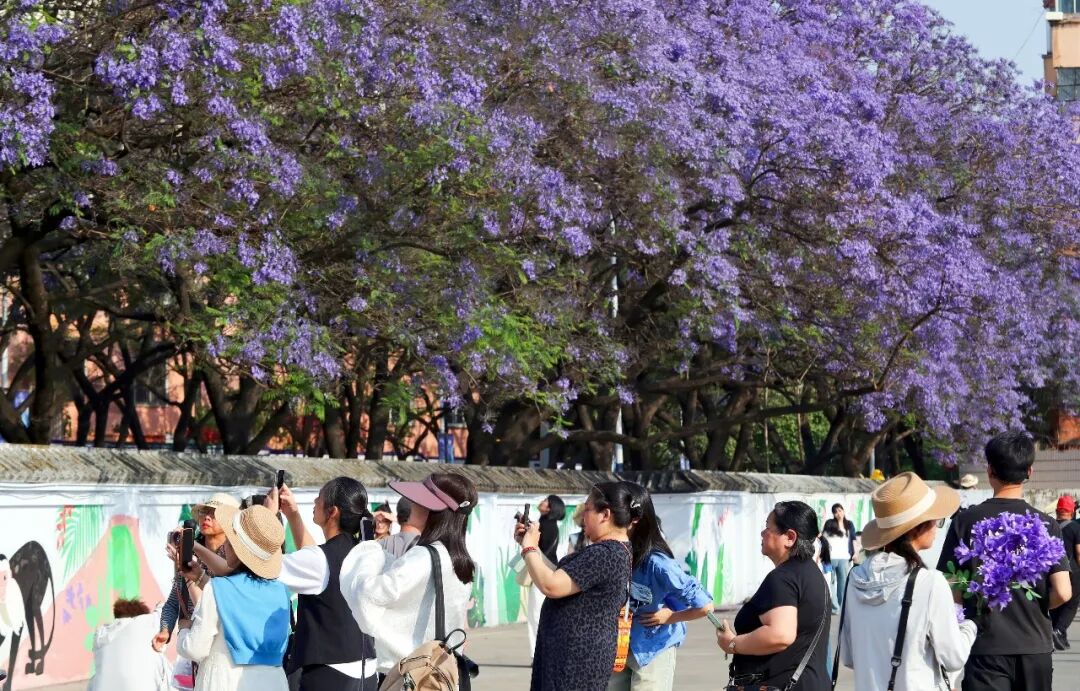 教场中路蓝花楹初放,整条街区人潮涌动、车水马龙。记者 杨峥 摄