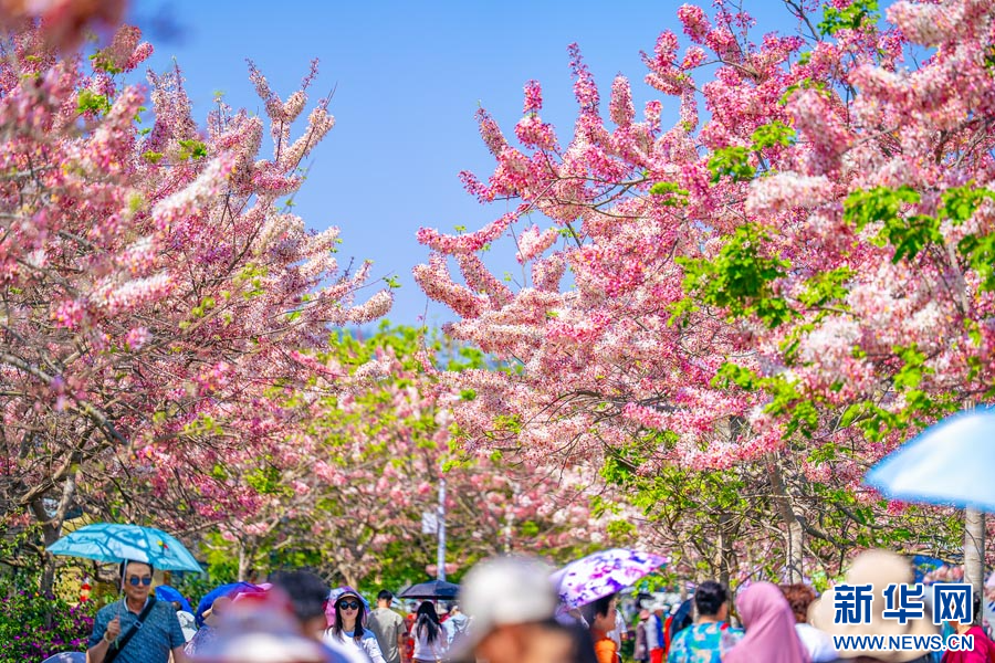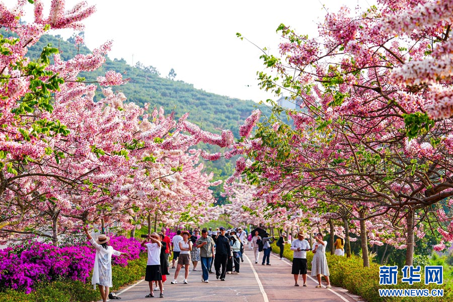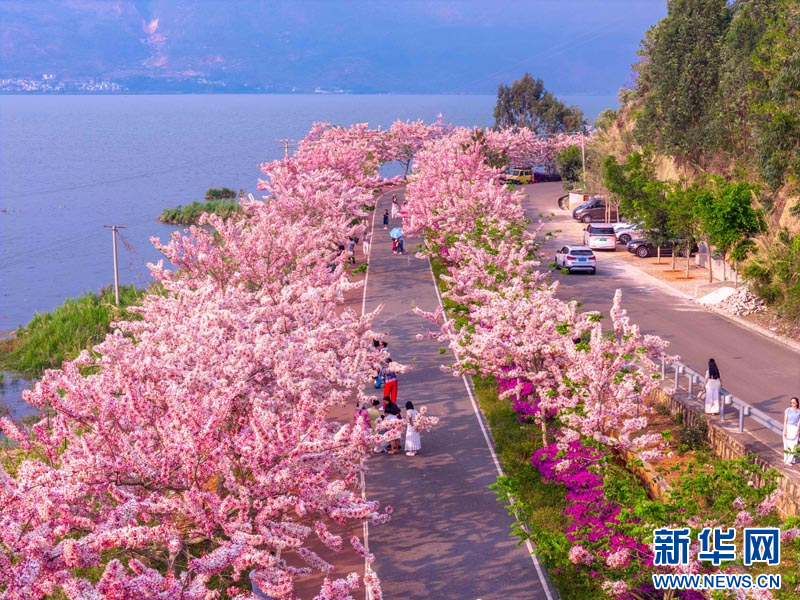 近日,云南省红河哈尼族彝族自治州石屏县异龙湖畔的万株神黄豆花迎来盛花期。漫步于异龙湖国家湿地公园,清澈的湖水与岸边连绵的粉色花海交相辉映。微风拂过,簇拥在枝头的神黄豆花随风摇曳,宛如层层叠叠的粉色云霞。(徐俊)