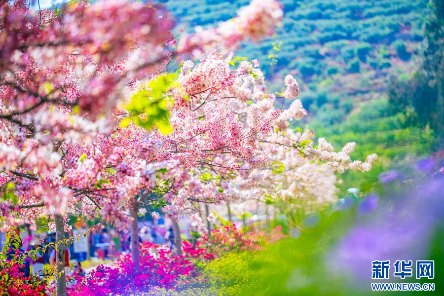 游客在神黄豆花下拍照(4月19日摄)。新华网发(徐俊 摄)